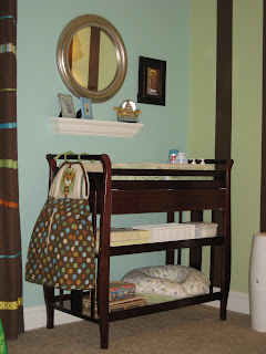 Three walls are a soft Aqua blue and the other wall is a soft green with chocolate stripes. The crib was a gift from my parents and my sister and brother-in-law. The chocolate brown curtain panels came from TJ Maxx. I sewed all the ribbon on…yeah, that was a JOB. Rather, insane I think!