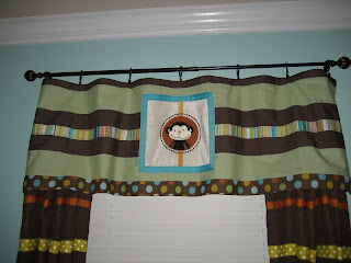 I made the curtain valances from one valance that came with the crib bedding set. I took the tab-top valance apart and used the pieces. The polka dot fabric at the bottom of the valance and the monkey (giraffe on the other window) are from the original valance. The green fabric is from a bed sheet that I got at JC Penney outlet. After a little brown broadcloth, some ribbon and a LOT of work, it was good to go!