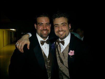 The bridesmaids carried chocolate brown roses in silver trumpet vases. The groomsmen wore pink leather flower boutioneers. They were kinda funky which I really loved!